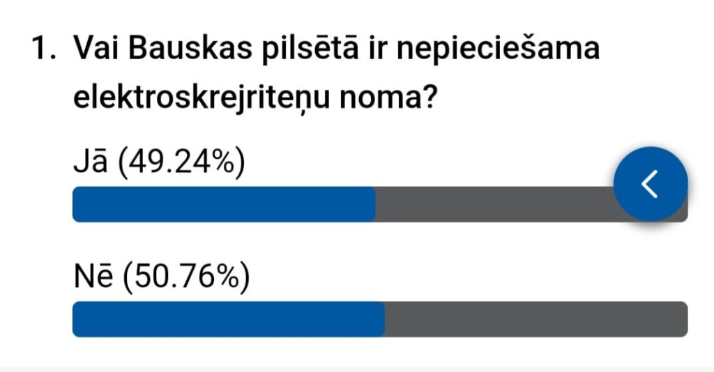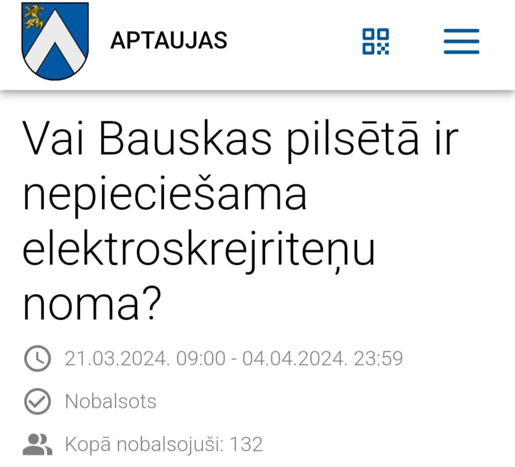 Līdz ceturtdienai, 4. aprīlim, Bauskas novada iedzīvotāji var piedalīties aptaujā par nomas elektrisko skrejriteņu pakalpojuma nepieciešamību Bauskas pilsētā. Līdz otrdienai, 2. aprīlim, Bauskas novada pašvaldības mobilajā lietotnē aptauju bija aizpildījuši 132 iedzīvotāji. Balsojums šobrīd ir diezgan līdzīgs – vairāk kā 50 % neatbalsta elektroskrejriteņu nomu Bauskā, bet 49 % aptaujas dalībnieku iebildumu nav un piekrīt šāda pakalpojuma pieejamībai pilsētā.