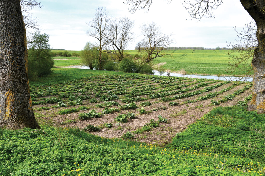 Zemes gabals rabarberiem iedalīts ar skaistu skatu uz līkumoto Īslīces upi. Audzēšanas vieta, Sandras vārdiem, izvēlēta darba procesā, vadoties gan pēc novērojumiem, gan intuīcijas. Uzarot zemi, kurā kādu laiku nekas nebija audzēts, labi varēja redzēt, kā augsne mainās – tagadējā rabarberu laukā tā bija salīdzinoši tumša un auglīga, bet jau uz smiltsērkšķu audzes pusi arvien mālaināka un mālaināka. Tāpēc rabarberiem tika tieši tas lauks, kurā šobrīd viņi aug, jo tas bija piemērotāks ēdelīgajai kultūrai. Tagad Sandra atzīst, ka toreiz trāpīts pareizi: rabarberiem nogāzītē ir aizvējš, un vienlaikus tur labi turas mitrums. Dažkārt pavasaros saimniecības viesi jautājot, vai rabarberi audzēti siltumnīcā, ka tik ātri jau ienākušies. Arī šopavasar tie būtu jau lielāki, ja vien kāds no aukstuma viļņiem nebūtu tos piebremzējis un dažu labu pat nedaudz apsaldējis. Sandra salīdzinājusi ar pērnā gada ražas ievākšanas laiku – uz šo pašu brīdi pagājušajā gadā noplūkti jau kādi simts kilogrami, tagad vien pa druskai – ap 20, 30 kilogramiem. Bet bažām neesot pamata, jo tiklīdz atsāksies siltums, rabarberi strauji saaugs. Turklāt šogad pietiek arī mitruma.