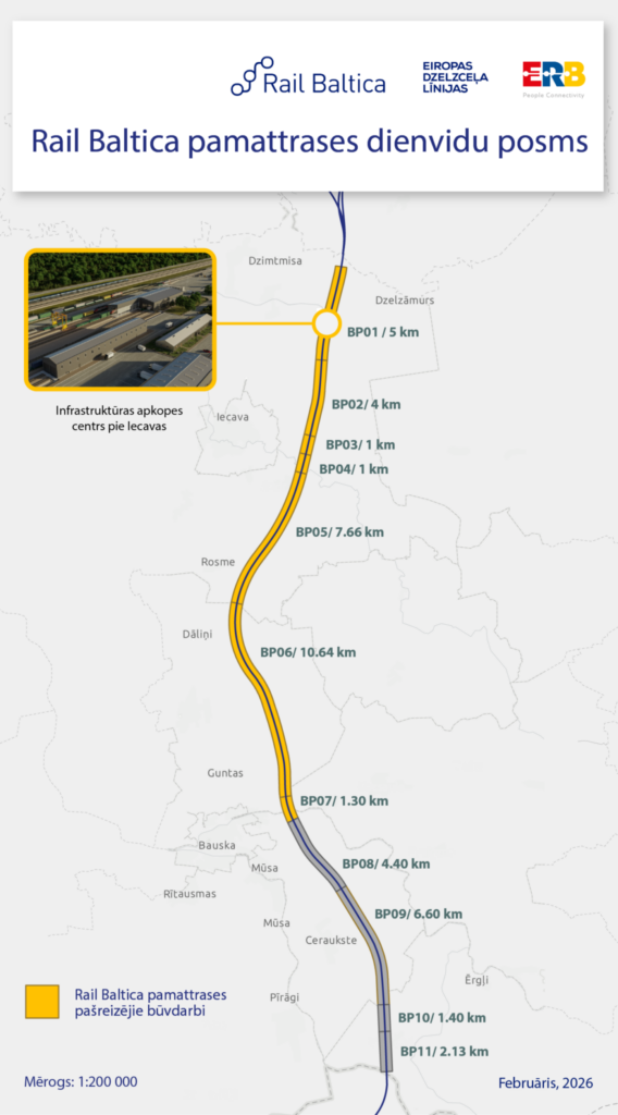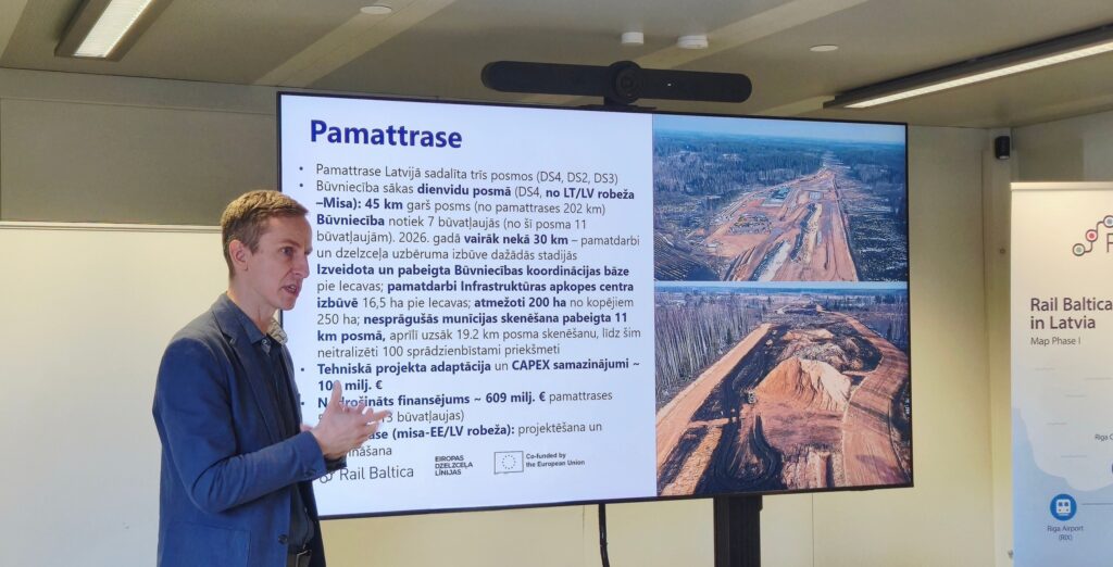 Savukārt pamattrases būvnieka – uzņēmuma “ERB Rail” pārstāvis Māris Saukāns informēja par dienvidu posma (Lietuvas robeža–Misa) būvdarbu progresu – darbi šobrīd norit aptuveni 30 kilometru garumā septiņās būvatļaujās ar mērķi sākt dzelzceļa uzbēruma izbūvi. Prioritārais dienvidu posms ir aptuveni 45 kilometru garš un ir sadalīts 11 būvatļaujās.