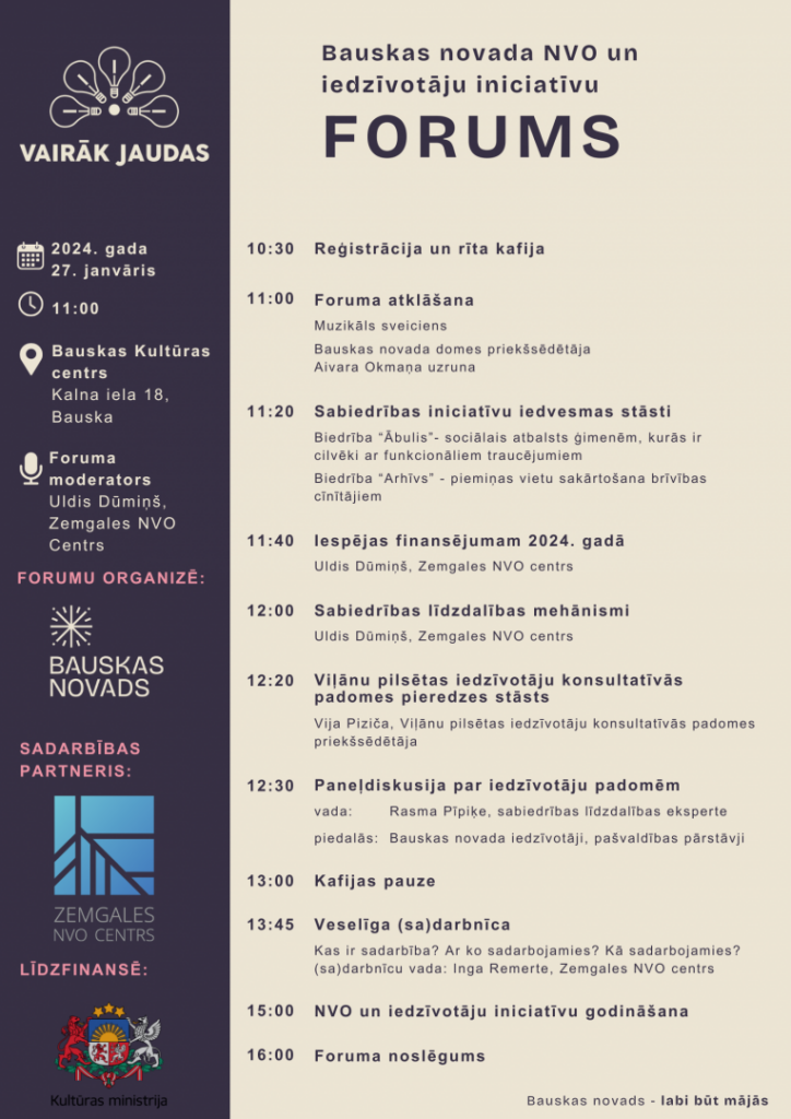 Forumā organizatori aicina piedalīties gan reģistrēto biedrību un nodibinājumu, gan neformālo iedzīvotāju grupu pārstāvjus, kā arī interesentus, kuri vēlas aktīvāk iesaistīties vietējās kopienas sabiedriskajā dzīvē. Forumā būs iespēja saņemt aktuālo informāciju par Bauskas novada pašvaldības atbalstu 2024. gadā un finansējuma iespējām dažādām NVO iniciatīvām. Varēs ieklausīties viedokļos un pieredzes stāstos par iedzīvotāju padomju darbību.