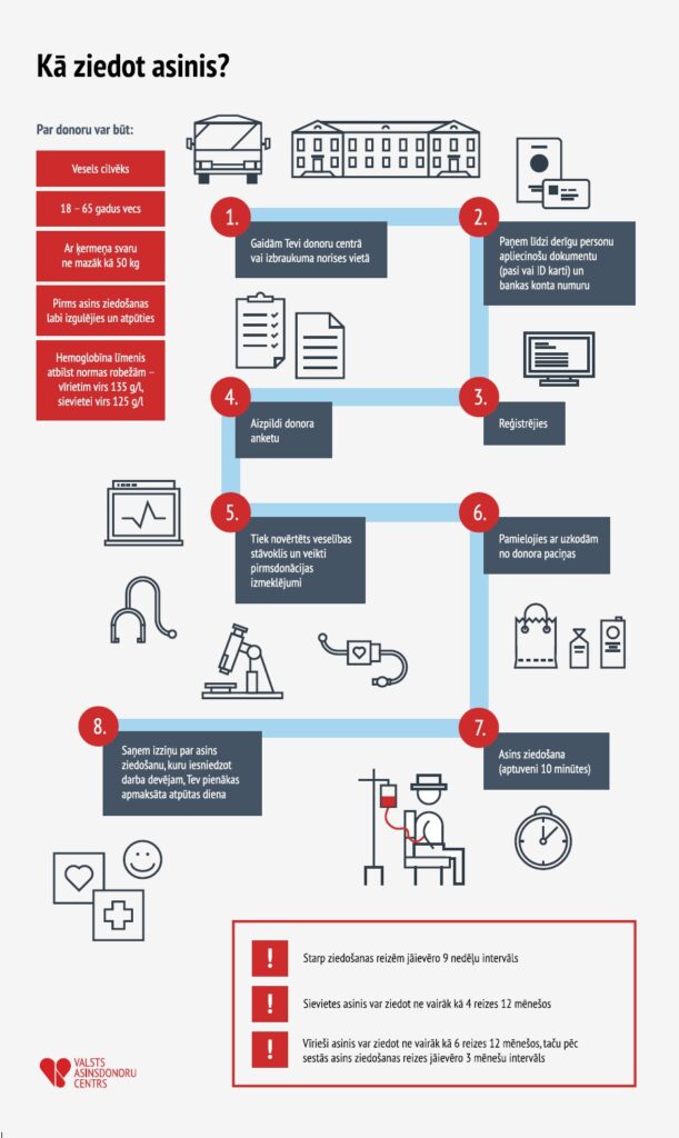Lai ziedotu asinis, līdzi jāņem derīga pase, eID karte vai jebkurš cits personu apliecinošs dokuments, kas satur šādu informāciju: personas kodu, vārdu, uzvārdu, foto, jānosauc arī bankas konta numurs.