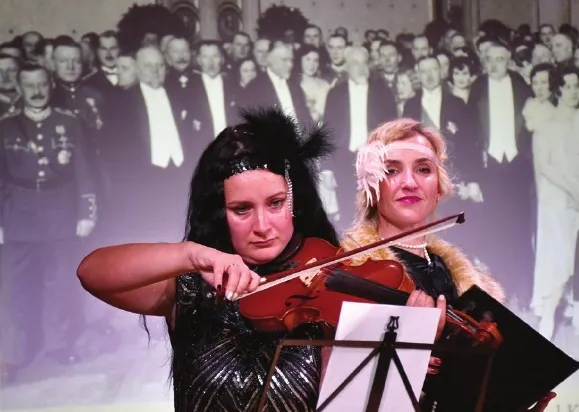 PAGĀJUšĀ GADSIMTA 20. – 30. gadu stilā muzicēja un dziedāja sieviešu vokālais ansamblis «Naktsvijoles». Vijoli spēlē ansambļa vadītāja Kristīne Kudrjavceva. Fonā – attēls no Preses balles Rīgā 1929. gadā. Foto: Ivars Bogdanovs