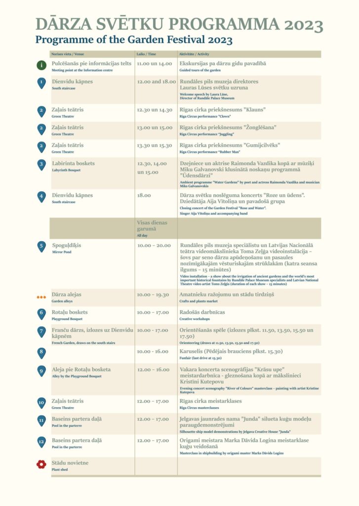 Ar brīnumiem un pārsteigumiem svētkus bagātinās Rīgas cirka skolas priekšnesumi un meistarklases, bet klusinātās noskaņās dārzā izskanēs aktrises Raimondas Vazdikas un mūziķa Mika Galvanovska muzikālā dzejas programma “Ūdensdārzi”.