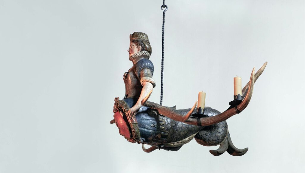 Ragu lustra ar vāravas figūru no Gramzdas luterāņu baznīcas. Kurzeme, 1596. Koks (liepa), tempera, sudraba lapiņas, krāsainas lakas. 55 x 65 cm, figūras biezums – līdz 21 cm. Rundāles pils muzeja kolekcija.