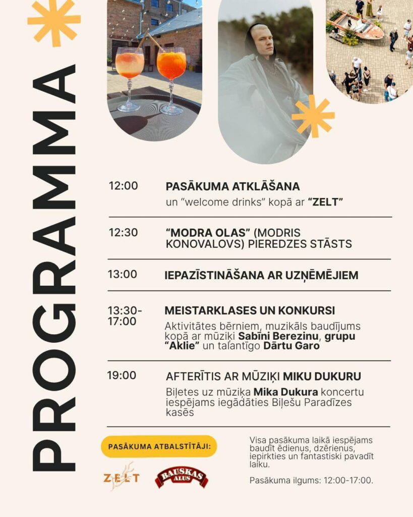 No pulksten 13:30 līdz 17 notiks meistarklases un konkursi, par muzikālu noskaņu rūpēsies Sabīne Berezina, grupa “Aklie” un Dārta Garā. Pasākuma noslēgumā uzstāsies Miks Dukurs (ieeja ar atsevišķām biļetēm).