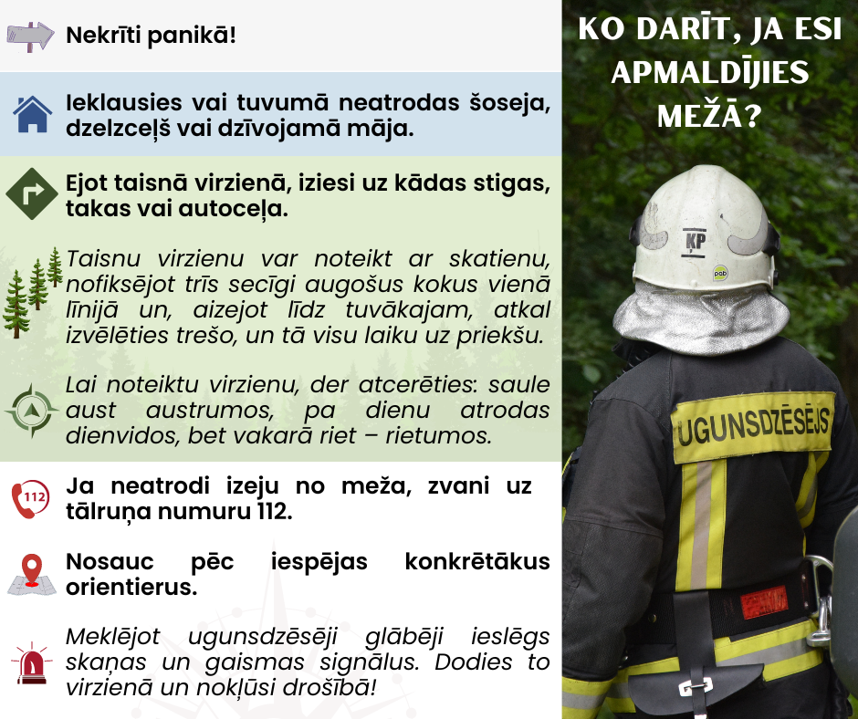 VUGD Operatīvās vadības pārvaldes priekšnieks Kristaps Kolbergs skaidro: «Sākoties ogu un sēņu laikam, regulāri saņemam palīdzības saucienus no tiem, kas apmaldījušies mežā. Šādi glābšanas darbi tiek īstenoti kopā ar Valsts policiju, un ugunsdzēsēji glābēji visbiežāk ieslēgs autocisternas skaņas signālu un tumšajā laikā arī gaismas signālu, lai cilvēkiem norādītu, kurā virzienā atrodas izeja no meža. Uzmanīgi jāieklausās un, to sadzirdot, jādodas skaņas virzienā. Ja būs nepieciešams, apmaldījušos cilvēku meklēsim, teritoriju no augšas pārskatot ar dronu, kurš aprīkots arī ar termokameru.» K. Kolbergs atzīst, ka to, cik operatīvi cilvēku izdosies atrast un izglābt, bieži nosaka tas, vai personao ir līdzi uzlādēts mobilais telefons. Ja cilvēks ir zvanījis uz vienoto ārkārtas palīdzības izsaukumu tālruņa numuru 112, lai ziņotu par apmaldīšanos, tad, visticamāk, ugunsdzēsēji glābēji ar viņu sazināsies, lai apmainītos ar informāciju un dotu norādes, piemēram, ko cilvēks redz apkārt, vai dzird skaņas signālu. «Tāpēc, ja esat apmaldījušies mežā, pirmajam un vienīgajam zvanam jābūt uz tālruņa numuru 112. Visticamāk, ka dispečers varēs noteikt jūsu aptuveno atrašanās vietu, bet glābēji sazināties, lai pēc iespējas ātrāk izvestu ārā no meža. Zvani radiniekiem vai draugiem izlādē telefona bateriju un līdz ar to var apgrūtināt un paildzināt glābšanas darbus.»