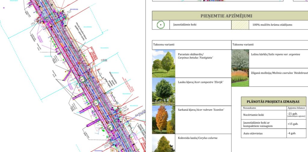 Koku eksperts ir izstrādājis priekšlikumu projekta izmaiņām. Viņš iesaka projekta ietvaros izveidot vismaz 15 jaunas koku stādvietas, kas kompensētu 21 nozāģēto koku. Šīs stādvietas iespējams plānot, būtiski nemainot sākotnējo projekta konfigurāciju, “upurējot” tikai četras autostāvvietas. Stādījumu izvietojums būtu pēc principa, ka ik pēc četrām autostāvvietām paredzama viena koku stādvieta, lai nodrošinātu pietiekamu augšanas telpu.