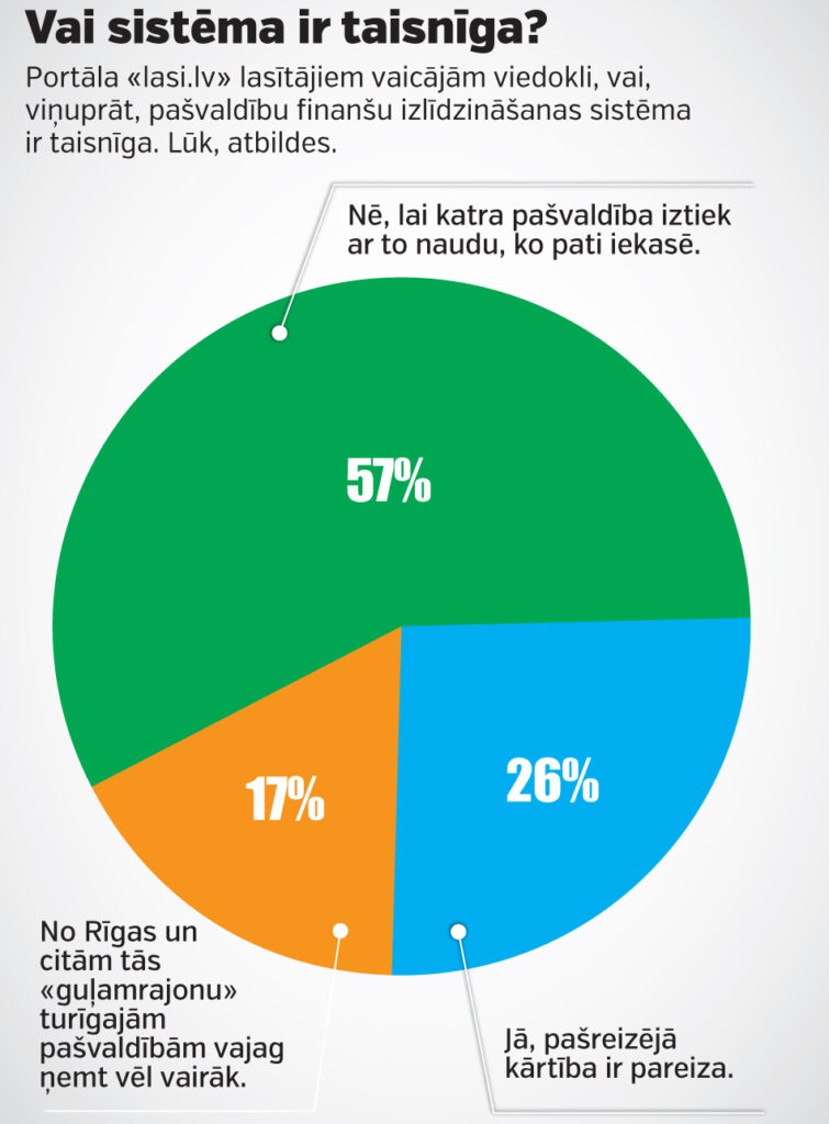 Lielākā vidējā mēneša bruto darba samaksa ir Rīgā un Rīgas reģionā. Tāpat šajā reģionā ir lielākais iedzīvotāju un darba vietu skaits, attiecīgi Pierīgas pašvaldībām ir arī lielākie IIN ieņēmumi. Līdzīga situācija ir ar nekustamā īpašuma nodok-li – deviņu Rīgas reģiona pašvaldību nekustamā īpašuma nodokļa ieņēmumi, kas piedalās izlīdzināšanā, veido 64% no kopējiem nekustamā īpašuma nodokļa ieņēmumiem PFI aprēķinā, un attiecīgi pārējo 34 pašvaldību daļa ir tikai 36%. Vienlaikus jāatzīmē, ka Rīgas reģiona pašvaldībās deklarētā dzīvesvieta ir 47% Latvijas iedzīvotāju,» tā «Latvijas Avīzei» vēsta Lāsma Ūbele.