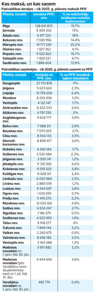 Rīgas plānotā iemaksa ir vislielākā – 138,6 miljoni eiro jeb 15,7% no iedzīvotāju ienākuma nodokļa (IIN) ieņēmumiem. Cik maksās un cik saņems pārējie – skat. tabulu.