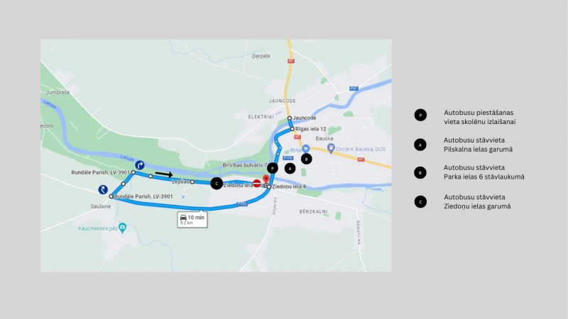 Tāpat pasākuma norises dienās Pilskalna un Ziedoņu ielas garumā, kā arī Parka ielas stāvlaukumā (pretī Bauskas pilsētas stadionam) tiks novietoti skolēnu autobusi, kas aizņems daļu no brauktuves un visu stāvlaukumu.
