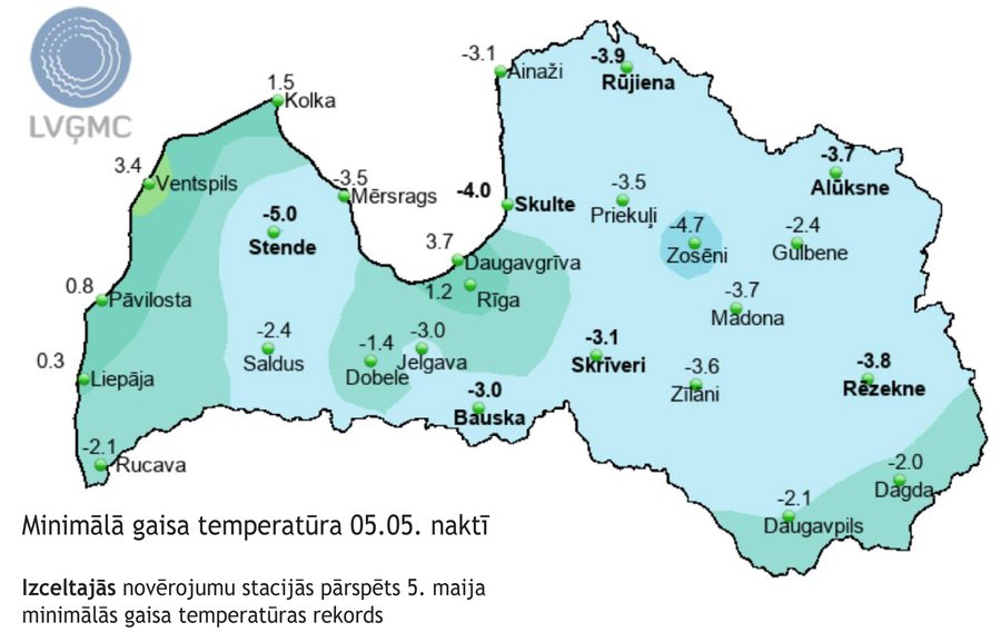Aizvadītajā naktī septiņās meteoroloģisko novērojumu stacijās labots 5.maija minimālās gaisa temperatūras rekords, liecina Latvijas Vides, ģeoloģijas un meteoroloģijas centra (LVĢMC) apkopotie dati.