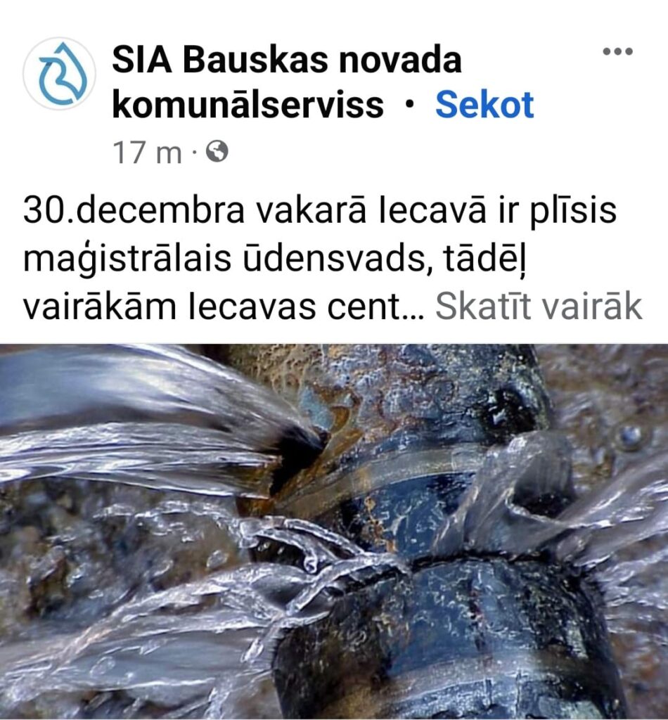 Sestdienas, 30. decembra, vakarā Iecavā ir plīsis maģistrālais ūdensvads, tādēļ vairākām Iecavas centra ēkām ir pilnībā pārtraukta ūdens padeve, tā sociālajos tīklos informējuši SIA “Bauskas novada komunālserviss” (BNK) pārstāvji.