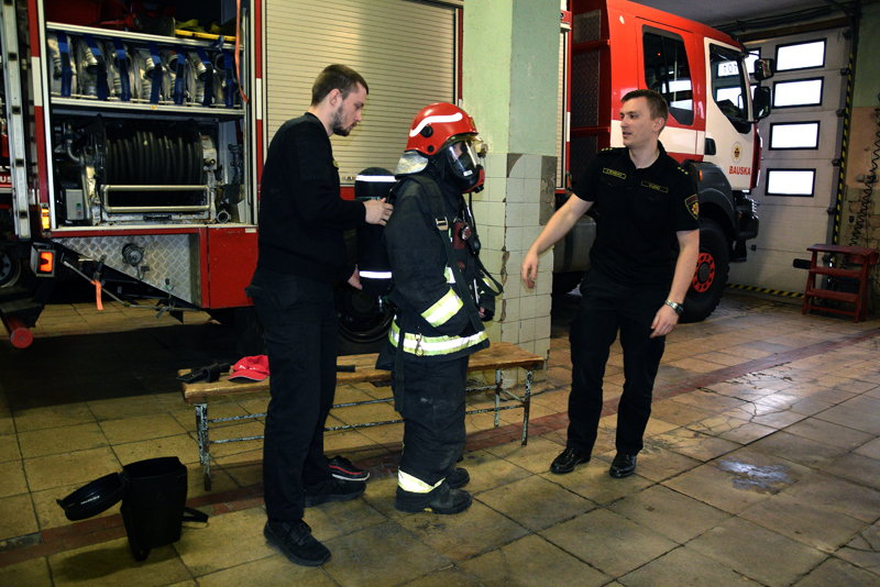 Viņam bija iespēja arī uzvilkt ugunsdzēsēju glābēju spectērpu. Beigās uzlika arī ķiveri. Tas viss jāpagūst 30 sekunžu laikā, Jevgēnijam palīdzēja un stāstīja Edgars Šermuks, vada komandieris, 90 sekundēs jāizbrauc. Ciemiņam bija iespēja arī paturēt rokās ugunsdzēsēju cirvi, kas «daudz darba redzējis». Jevgēnijs atzina, ka ir smagi pakustēties, bet vēl viņš tika pie elpošanas maskas un aparāta, ar kuru sarežģītos apstākļos var strādāt no 20 līdz 30 minūtēm.