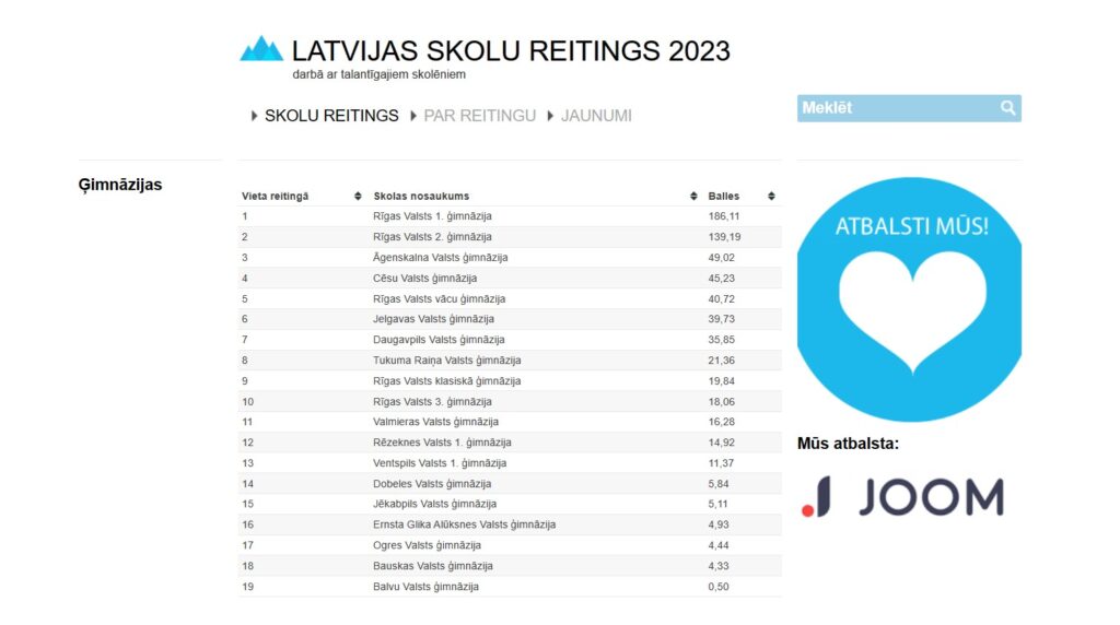 No apkopotās informācijas izriet, ka starp skolām, kas ieņem pirmās vietas, un pārējām ir ievērojama iegūto punktu starpība. Piemēram, Bauskas Valsts ģimnāzija ar iegūtajām 4, 33 ballēm ieņem pirmspēdējo vietu, bet augšgalā – pirmajā pozīcijā ar 186,11 ballēm ierindojusies Rīgas Valsts 1.ģimnāzija, savukārt otrajā vietā ar 139,19 ballēm ir Rīgas Valsts 2.ģimnāzija, bet trešo vietu ieņem Āgenskalna Valsts ģimnāzija, kuras sniegums šogad novērtēts ar 49,02 ballēm.