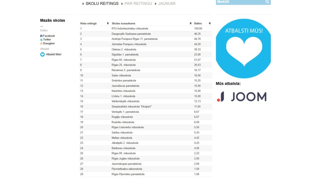 RTU Inženierzinātņu vidusskola ar 159 ballēm stabili noturējusi līderpozīcijas reitinga mazo skolu grupā. Otrajā vietā ar 46,25 ballēm ierindojusies Daugavpils Saskaņas pamatskola, bet trešajā vietā ar 44,78 ballēm – Andreja Pumpura Rīgas 11.pamatskola.