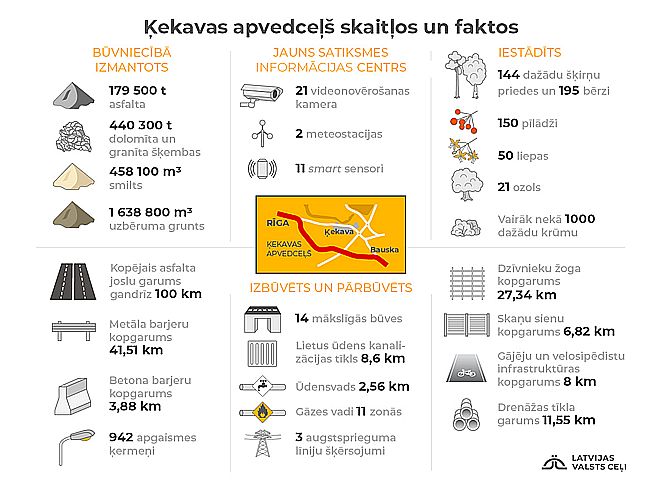 Ķekavas apvedceļa trasē uzstādīti vairāk nekā 900 apgaismes ķermeņi, 40 km metāla un 4 km betona drošības barjeru. 7,5 km  ir uzstādīti prettroķšņu risinājumi – sienas un grunts vaļņi. Ierīkoti arī 27 km dzīvnieku žoga.