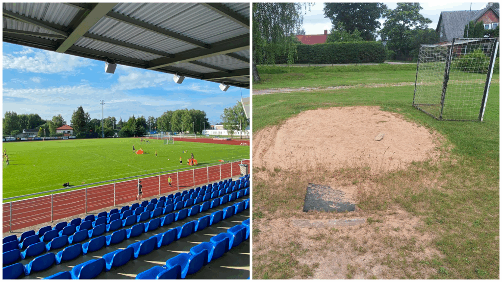 Titulattēlā – stadions Iecavā (pa kreisi) un stadions Vecumniekos. Foto autori: Megija Piebalga/ Raimonds Rudzāts/LTV