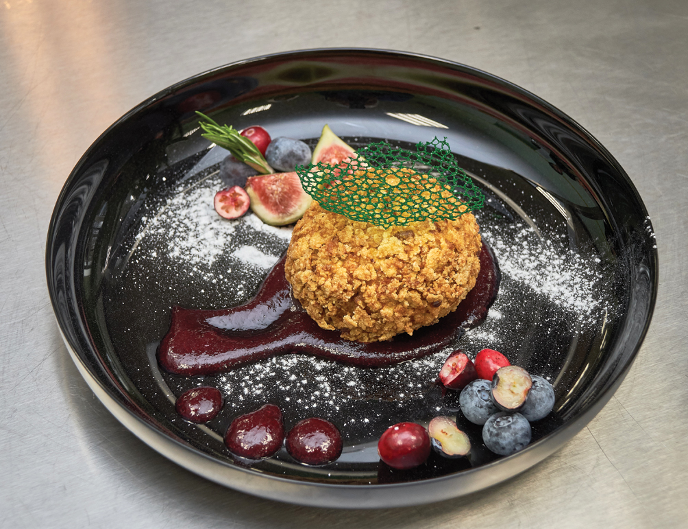 Liek uz šķīvja un pasniedz ar dzērveņu mērci. Dekorē ar svaigām ogām un piparmētru.