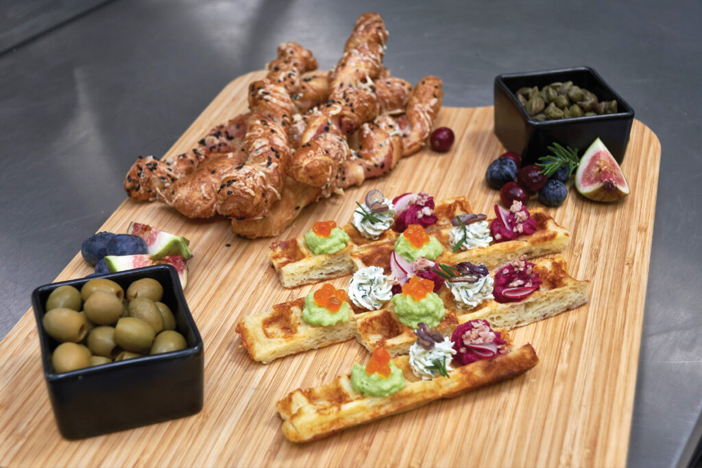 Uz pannas apgrauzdē bekonu un sasmalcina. Uz pannas izkausē sviestu ar cukuru un karamelizē sīpolu ripiņas. Dažādos krēmus liek uz vafeles, pa virsu liek ikrus, grauzdētu bekonu, karamelizētus sīpolus un rotā ar zaļumiem.