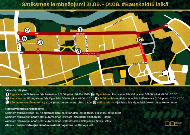Pašvaldība aicina atbrīvot Rīgas ielu no automašīnām, sākot no 31. maija pusnakts līdz 1. jūnija pulksten 17. Tāpat lūgums nenovietot automašīnas Pasta ielā 1. jūnijā no plkst. 6 līdz 22. Aicina nenovietot automašīnas Saules ielā, Kalēju ielā, Smilšu ielā.
