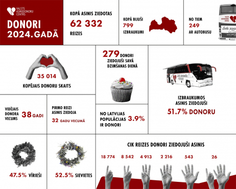 Pagājušogad bijusi lielākā asinsdonoru atsaucība pēdējo 12 gadu laikā, liecina VADC apkopotā informācija. Visā Latvijā asinis ziedotas 62 332 reizes, kas ir par 2 420 reizēm vairāk nekā gadu iepriekš.