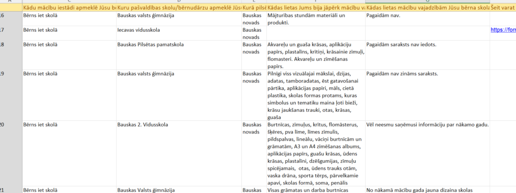 Viņš atklāja, ka bijuši gan lieli saraksti, gan atsevišķas vienības, kuru iegādi izglītības iestādes likušas uz vecāku pleciem, kaut arī tās būtu bērnudārza vai skolas pašas iepirkumu sarakstā. Informācija saņemta no gandrīz visiem Latvijas novadiem, visvairāk no Rīgas un lielākajām pilsētām – Liepājas, Jelgavas, Valmieras, Ogres u.c.