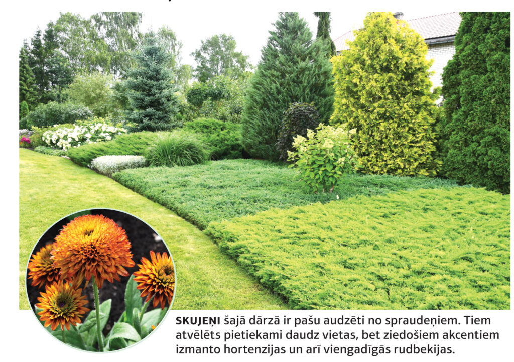 Rozēm izbijušajā Beibežu purvā nepatīk, bet ir cita kokaugu grupa, kura šādos apstākļos jūtas lieliski. Inese gan atceras, ka sākumā bija absolūta skujeņu pretiniece, jo tajā laikā pie katras sabiedriskās ēkas bija pa šo augu klājienam. Taču dzīvē sanāca citādi, un labi, ka tā – skujeņi ir skaisti visu gadu.