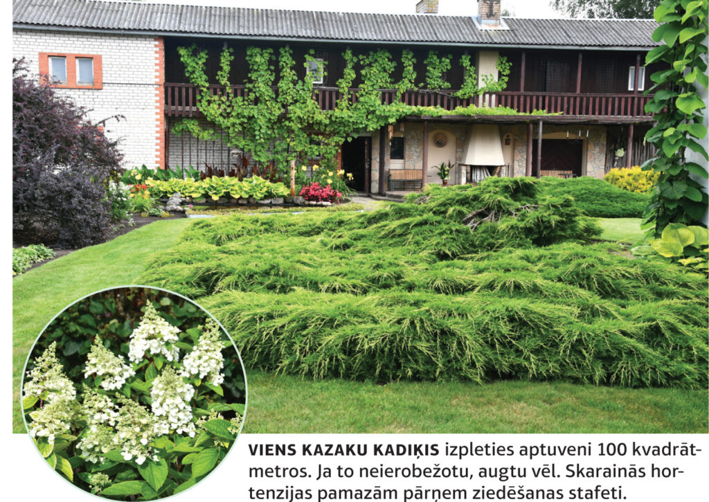 Dārzs papildināts arī ar skarainajām hortenzijām, lai tās turpinātu ziedēšanas maratonu. Vēlāk rudenī pie mājas saplauks arī mežvīteņu gaiši zilās ziedu kupenas.