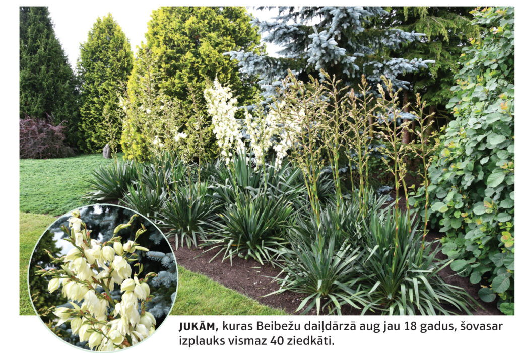 Pēdējo gadu modes augs – juka – Strūbergu dārzā aug jau kādus 18 gadus. Ja vien šiem augiem patīk vieta un apstākļi ir labvēlīgi, rezultāts liek elpai aizrauties – lielas, tumši zaļas, mūžzaļas zobenveida lapu rozetes, no kurām gaisā kā strūklaka izšāvies ziedkāts ar daudziem krēmkrāsas zvanveida ziediem. Reiz kā vārgu stādiņu to atvedusi meita no Dānijas, tagad tā ir liela un lekna grupa, kurā šobrīd ir pat 40 ziedkātu.