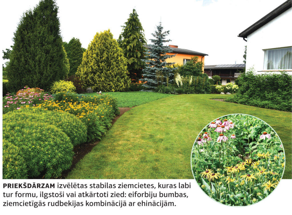 Augu sortiments sākotnēji bija plašs, taču palēnām tas atšķirojās. Piecpadsmit lietainās un pēc tam tikpat karstās vasaras ļoti labi parādīja, kā dažādiem augiem klājas nelabvēlīgos laikapstākļos. Turklāt bija ziemcietes, kas pēc noziedēšanas pilnībā zaudēja dekorativitāti. Tagad palikuši stabili augi, piemēram, eiforbijas, kas labi notur ieapaļo formu, zied atkārtoti un nenomet lapas arī ziemā. Priekšdārzam krāsu akcentam izvēlētas arī ziemcietīgās dzeltenziedu rudbekijas, kuras zied līdz pa salam, kombinācijā ar purpura ehinācijām. Ziemcietes tiek stādītas palielās grupās. Inesei patīk, ja ziedējums ir apjomīgs un to var kārtīgi «sadzerties».