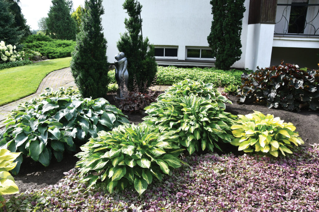 Arī šīs dobes agrāk bijušas raibākas, taču nu palicis tas, kas labi izskatās ne tikai ziedot, bet arī pēc ziedēšanas. Tikko kā noziedējusi vīteņhortenzija. Tās pakājē aug papardes un pahisandras – mūžzaļi krūmaugi, kuri jau 17 gadus nav nevienu lapu nometuši. Priekšplānā dramatiskāku noti piešķir zobainās ligulārijas tumšā šķirne. Ārkārtīgi skaisti tā izskatoties, kad metru augstumā izdzen savus dzeltenos ziedus. Šajās dobēs aug arī dažādas hostas – ar lapām mazu trusīšu ausu izmērā līdz milzīgām zilganos, dzeltenos un raibos toņos.