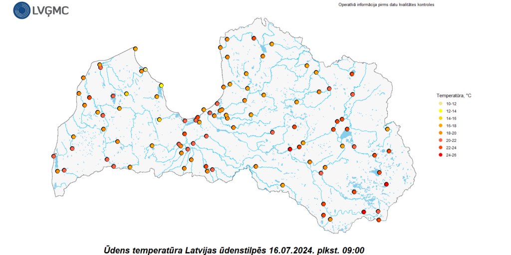 Šorīt ūdens temperatūra Daugavā bija 24…25 grādi, Latgales upēs 19…23 grādi, Vidzemes upēs 16…22 grādi, Zemgales upēs 19…22 grādi, Kurzemes upēs 17…22 grādi, ezeros un ūdenskrātuvēs 19…25 grādi, bet Baltijas jūras piekrastē 20…21 grāds un Rīgas līča piekrastē 10…22 grādi.
