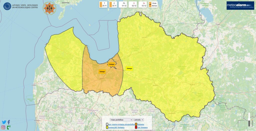 Novembra pēdējā diennaktī Latvijā ilgstoši snigs. Latvijas Vides, ģeoloģijas un meteoroloģijas centrs visā valstī izsludinājis dzeltenā un oranžā līmeņa brīdinājumus par snigšanu. Prognozēts, ka uzsnigs 10-15 centimetri sniega. Saskaņā ar publicēto karti Bauskas novadam piemērots oranžais brīdinājums par potenciāli bīstamiem laikapstākļiem.