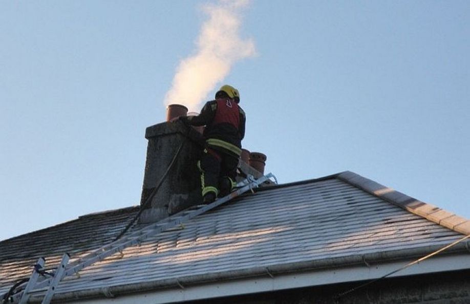 Ugunsdzēsēji glābēji dzēš degošus sodrējus mājas dūmvadā Uzvaras ielā Bauskā