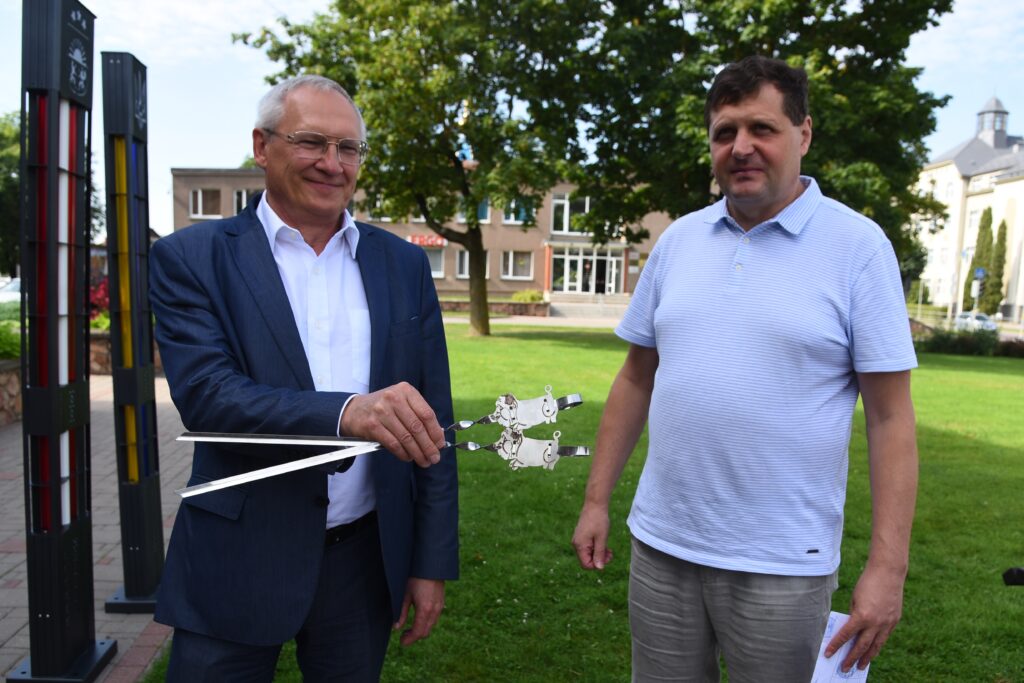 Leonīds Jakubovskis (no kreisās) un Oļegs Golovijčuks atveduši Bauskas novadam dāvanu no Ukrainas – apgaismes objektus abu valstu karogu krāsās. Dāvanu saņēma Aivars Okmanis. Foto – Uldis Varnevičs