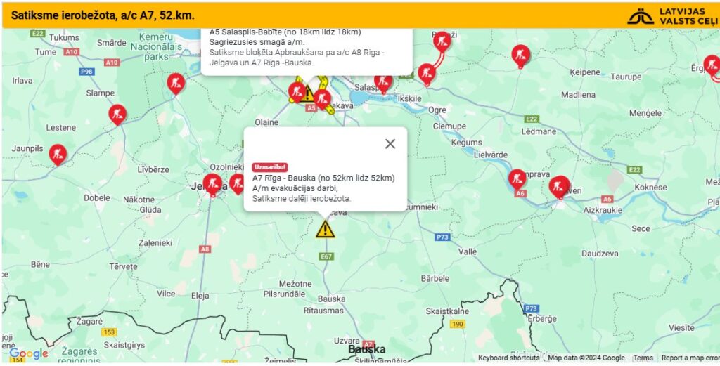 Slideno autoceļu dēļ Latvijā šorīt notikušas vairākas avārijas. Valsts policijas pārstāve Rūta Strautniece atklāja, ka uz maģistrāles A7  Codes pagastā ap pulksten pieciem no rīta kravas automašīna saslīdēja un iebrauca grāvī. Negadījumā neviena persona fiziski necieta. Pēc notikušā satiksme uz Bauskas šosejas tika bloķēta uz laiku, kamēr kravas automašīna evakuēta no ceļa. Pagaidām citu ceļu satiksmes negadījumu, kas būtu saistīti ar slidenām brauktuvēm, mūspusē nav bijis, apliecināja R. Strautniece.
