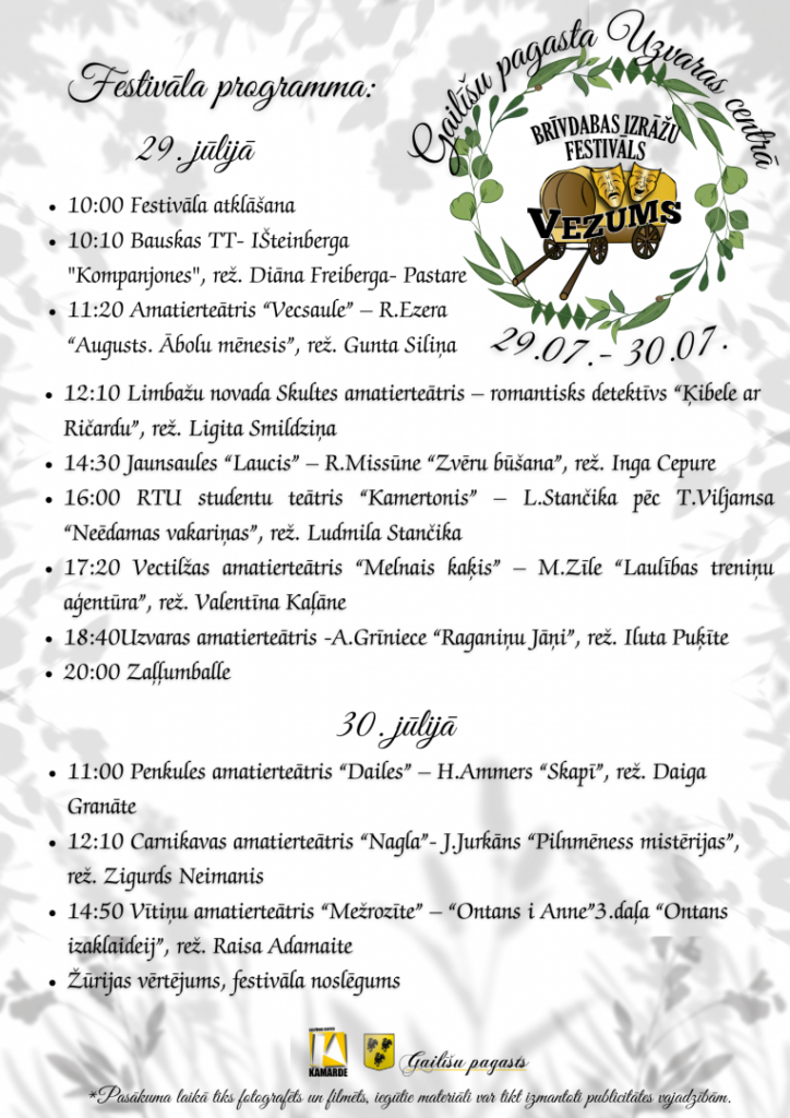 Pirmajā festivāla dienā atklāšana būs sestdien plkst. 10, un tā noslēgsies ar zaļumballi plkst. 20. Otrās dienas sākums paredzēts plkst. 11, un festivāla izskaņā žūrija sniegs savu vērtējumu un apbalvos šajā reizē labākos amatierteātrus.
