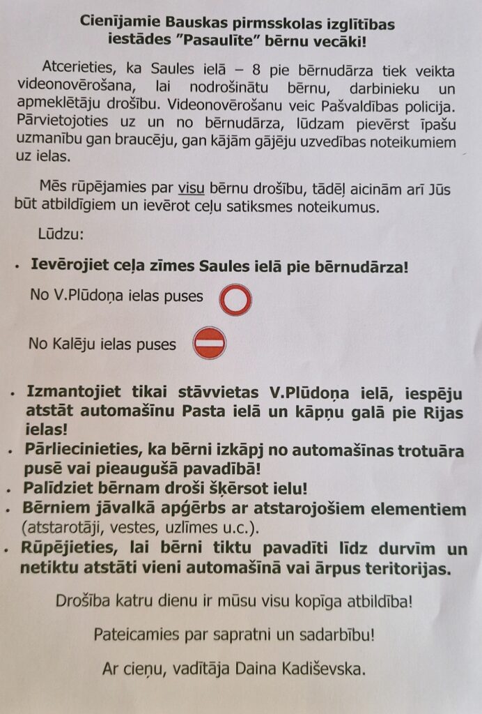 Pašvaldība norāda, ka līdzšinējā automašīnu novietošana un gājēju kustība ir bijusi neapmierinoša. Lai situāciju uzlabotu, pie bērnudārza vietā, kur ieejas un izejas durvis no teritorijas ir tieši pie ielas braucamās daļas, tiks ierīkota ceļa zīme “Bērni”, kā arī divi ātrumu ierobežojoši vaļņi.