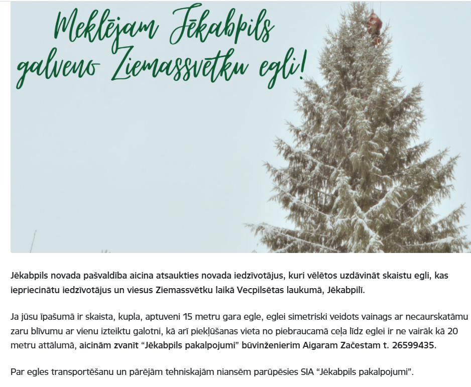 Vairākas pašvaldības Latvijā (piemēram, Jēkabpils, Kuldīgas, Aizkraukles novada vietvaras) šogad aicināja atsaukties iedzīvotājus, kuri vēlētos uzdāvināt svētku egli. Citviet egles sagādā vietējie uzņēmēji vai lauksaimnieki, kuri attīra savus īpašumus no nevajadzīgiem kokiem. Tāpat vairākās pilsētās, tostarp arī Bauskas novada Iecavā, katru gadu tiek svinīgi iedegta viena un tā pati eglīte, kas brīvi aug laukā, tādējādi ļaujot par mūžzaļo koku priecāties visu cauru gadu. L. Vasiļauska paskaidroja, ka Bauskā dabīgas egles uzstādīšana netika izskatīta, jo iedzīvotāji atzinīgi novērtējuši mākslīgo egli un pie šīs rotas arī paliks. Jāmin, ka līdzīgi kā iepriekšējos gados, Bauskas novada pašvaldība egli nomās, un tās svinīga iedegšana būs 7. decembrī.