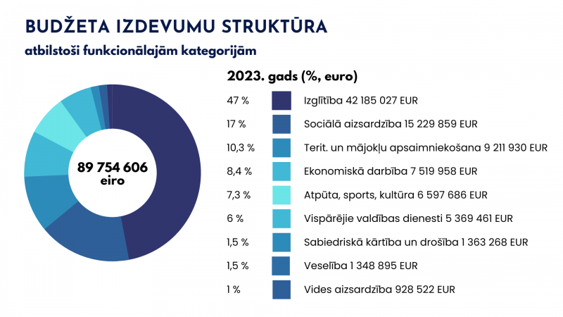 Izglītības jomas izdevumi veido lielāko pamatbudžeta izdevumu īpatsvaru – 42,2 miljoni eiro jeb 47% no pašvaldības pamatbudžeta izdevumiem. Brīvpusdienas 1.-4.klašu izglītojamiem no valsts budžeta līdzekļiem 327 532 eiro, no pašvaldības budžeta līdzekļiem 1.-9.klašu un piecgadīgo un sešgadīgo izglītojamo ēdināšanai 1,2 miljoni eiro. Pedagogu atlīdzībai ieplānoti nepilni 10 miljoni eiro.