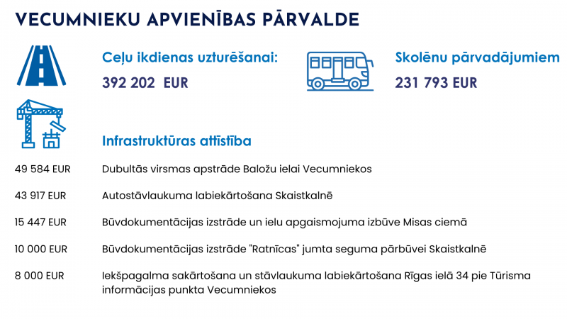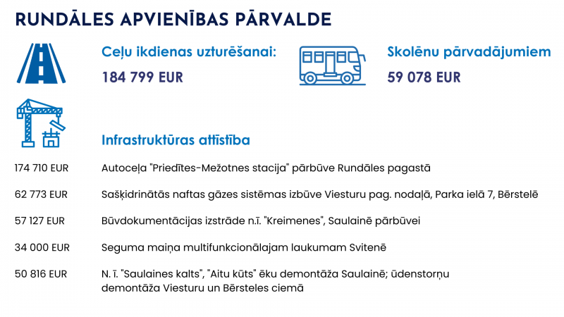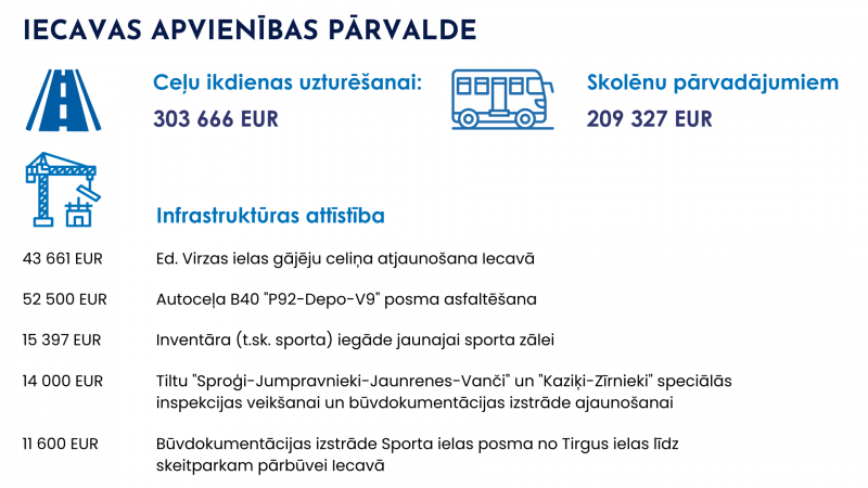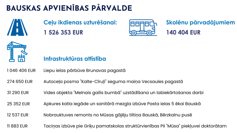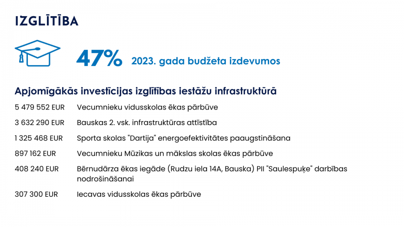 Lielākie izglītības infrastruktūras objekti šogad ir Vecumnieku vidusskolas ēkas pārbūve 5,5 miljoni eiro, Bauskas valsts ģimnāzijas un Bauskas 2.vidusskolas infrastruktūras attīstībai – 3,6 miljoni eiro, sporta skolas “Dartija” energoefektivitātes paaugstināšanai – 1,3 miljoni eiro, bet Vecumnieku Mūzikas un mākslas skolas ēkas pārbūvei – 0,9 miljoni eiro.