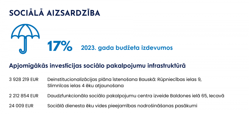 Izdevumi sociālajai aizsardzībai veido otro lielāko pamatbudžeta izdevumu sadaļu – 15,2 miljoni eiro, kas ir 17% no kopējiem pamatbudžeta izdevumiem.