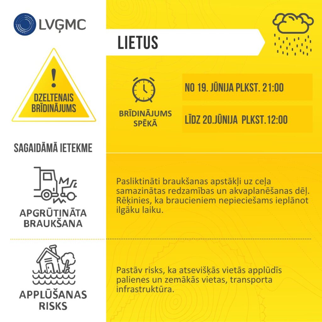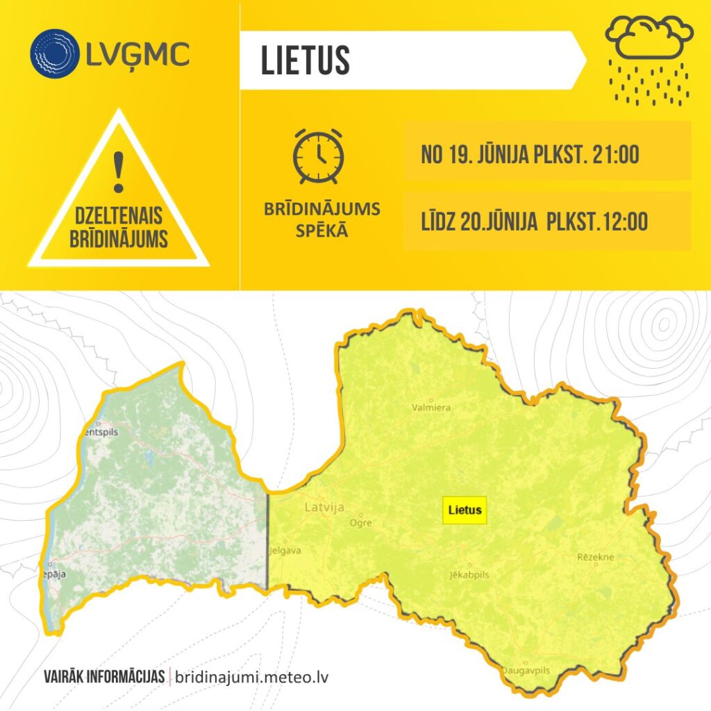 Dzeltenais lietus brīdinājums ir spēkā no 19. jūnija pulksten 21 līdz 20. jūnija pulksten 12.