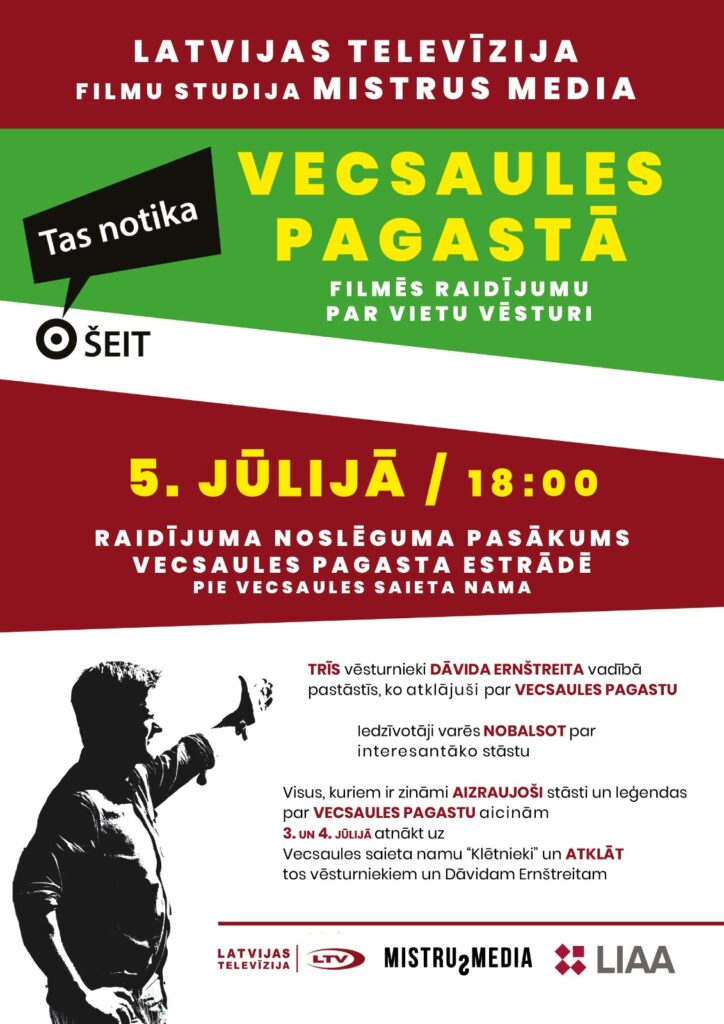 Šonedēļ Bauskas novada Vecsaules pagastā norisinās vēstures detektīva “Tas notika šeit” filmēšana, bet piektdien, 5. jūlijā, pulksten 18 Vecsaules estrādē pie vietējā saieta nama interesenti aicināti uz raidījuma noslēguma pasākumu. Vēsturnieki Inna Gīle, Edgars Plētiens, Gatis Krūmiņš LTV žurnālista Dāvida Ernštreita vadībā pastāstīs, ko atklājuši par Vecsaules pagastu. Klātesošie iedzīvotāji varēs nobalsot arī par interesantāko stāstu.