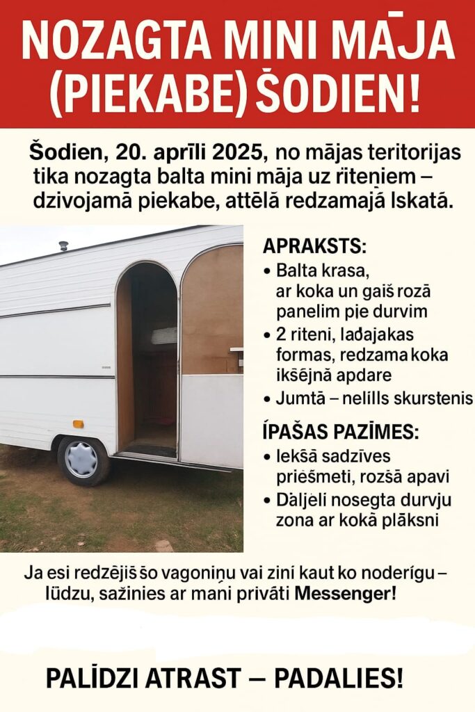 Svētdien, 20. aprīlī, no kādas privātmājas teritorijas Vecumniekos nozagts balts dzīvojamais vagoniņš-treileris, portālu informēja Valsts policijas pārstāve Rūta Strautniece-Apaļā. Par notikušo uzsākts kriminālprocess.