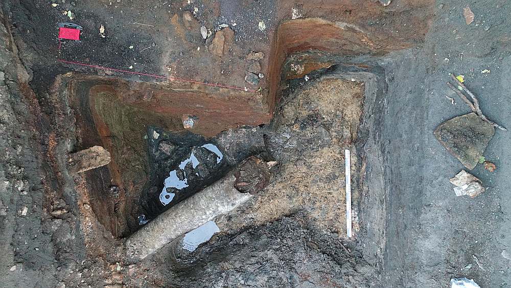 Foto: Arheologu atklātā dzelzsrūdas glabātava reiz izskatījusies pēc resniem baļķiem veidotas kastes. Vēl saglabājušās rūdas paliekas. Zaļais slānis, iespējams, ir izrūsējusi rūda vai smilts ar kādām piedevām.Foto – Dita Auziņa