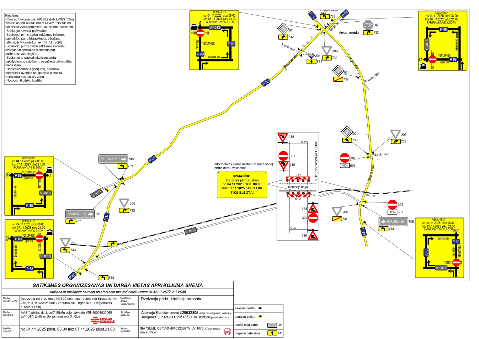Dzelzceļa pārbrauktuves rekonstrukcijas darbu laikā no 4. novembra plkst. 8 līdz 7. novembra plkst. 21: