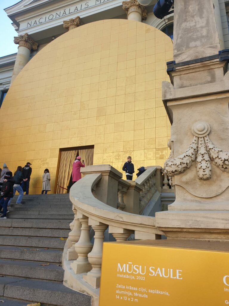 Katrs izvēlētais audzēkņa darbs izveidots zeltītā ciļņa plāksnē un ievietots instalācijā «Mūsu saule», kas uzstādīta pie ieejas Latvijas Nacionālajā mākslas muzejā. Foto – A. Sproģe.