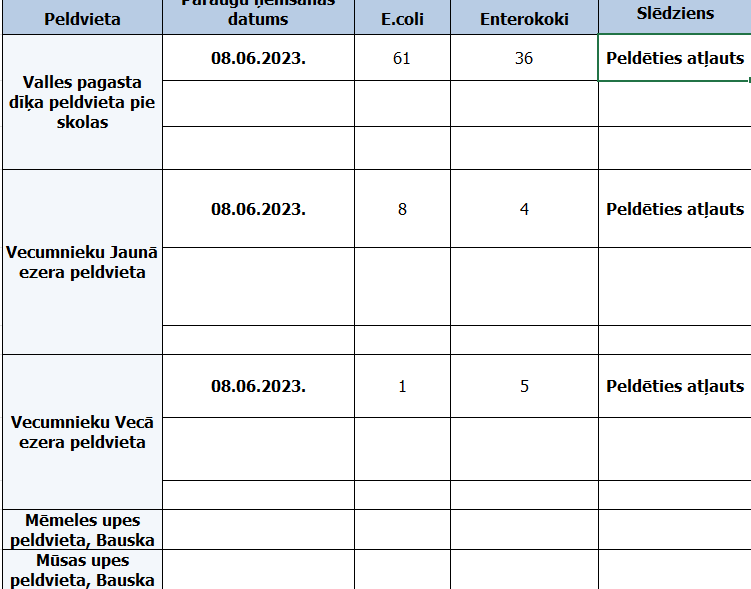 Saņemtie analīžu rezultāti apstiprina, ka ūdens kvalitāte atbilst higiēnas prasībām un minētajās peldvietās ir atļauts peldēties.