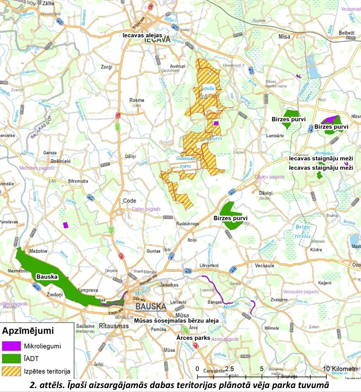 Saskaņā ar Dabas aizsardzības pārvaldes dabas datu pārvaldības sistēmā „Ozols” publicēto informāciju vēja parka izpētes teritorijas tuvumā ir četras īpaši aizsargājamas dabas teritorijas: dabas liegums “Birzes purvi”, dabas liegums “Iecavas staignāju meži”, dabas parks “Bauska” un dabas parks “Ārces parks”. Dabas parks Bauska  ir iekļauts arī Eiropas vienotajā aizsargājamo dabas teritoriju tīklā Natura 2000.